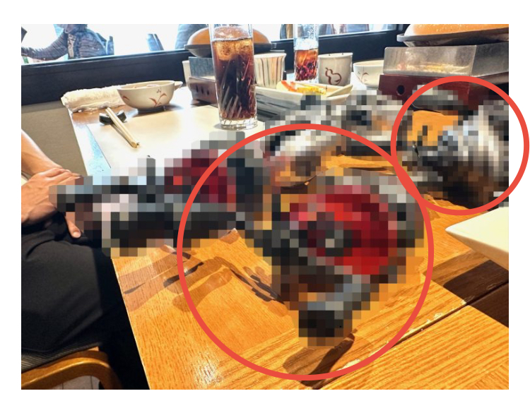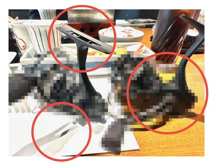 左下のサークルはテーブルに落ちた影に注目しています。光源が複数あるもののスポット光なので光線追跡が可能です。